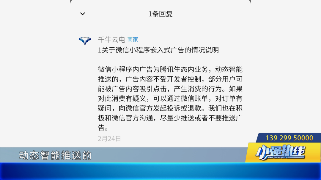 甚至,有商家在评价中回复:“微信小程序内广告为腾讯生态内业务,动态智能推送的,广告内容不受开发者控制”。