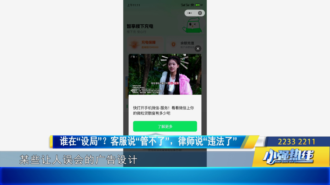 智享楼下充电平台客服:广告的问题我这边帮您解决不了,我们这边是不对这些进行监管或负责的,您只能找到他们投诉,我们这边是没有投诉渠道的,我们只负责充电的业务,其它业务不太清楚。