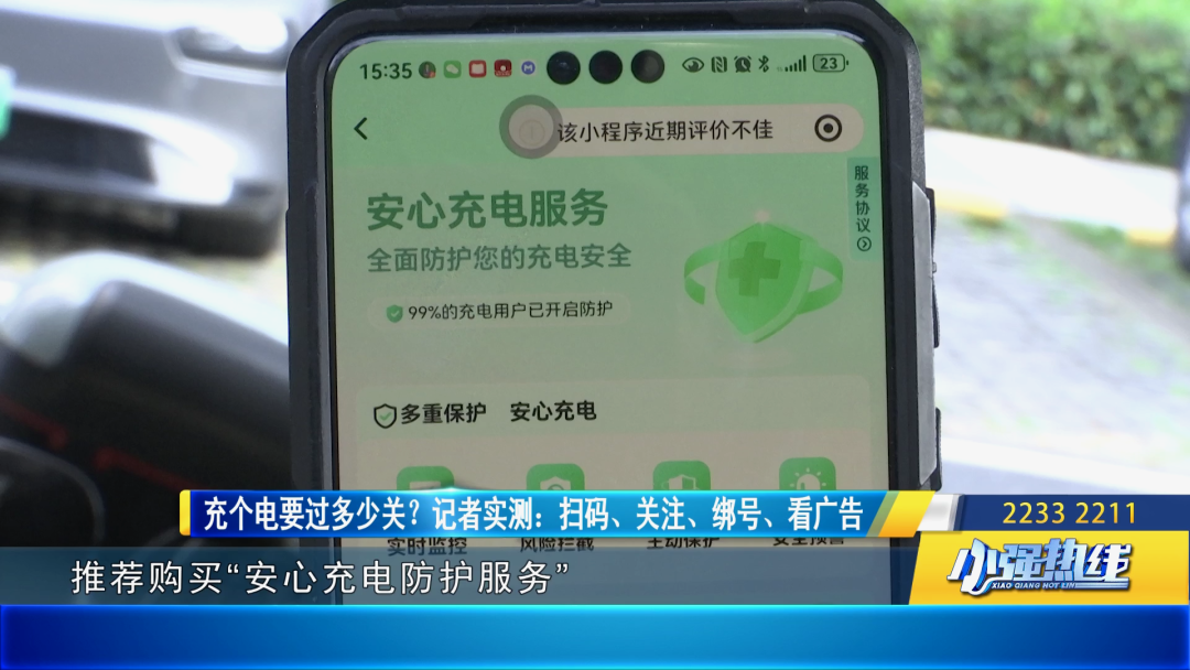 记者首先体验了“奈斯新能源”小程序。扫码后,一个5秒钟的开屏广告占满屏幕。好不容易等它倒计时结束,广告并没有消失,而是缩成一个悬浮窗,继续挂在页面角落。当记者准备支付时,又一个弹窗弹出,推荐购买“安心充电防护服务”,内容包括异常断电、负载短路等。
