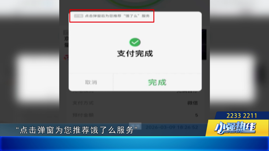 最离谱的当属“智享楼下充电”平台。记者在支付成功后,弹出一个窗口,上面有两个大大的按钮:“取消”和“完成”。记者点击“完成”,结果直接跳转到了“饿了么”小程序。回头看录屏才发现,原来这个弹窗本身就是广告,真正的关闭按钮藏在底部一行几乎看不清的灰色小字里——“点击弹窗为您推荐饿了么服务”。